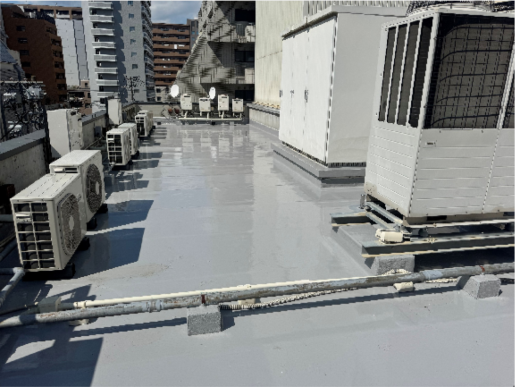ウレタン塗膜防水は、防水層が軽量で建築物への負担が少ないことに加え、複雑な形状や細部の取り合い部にも対応しやすい工法です。継ぎ目のないシームレスな防水層を形成できるため、防水性にも優れています。